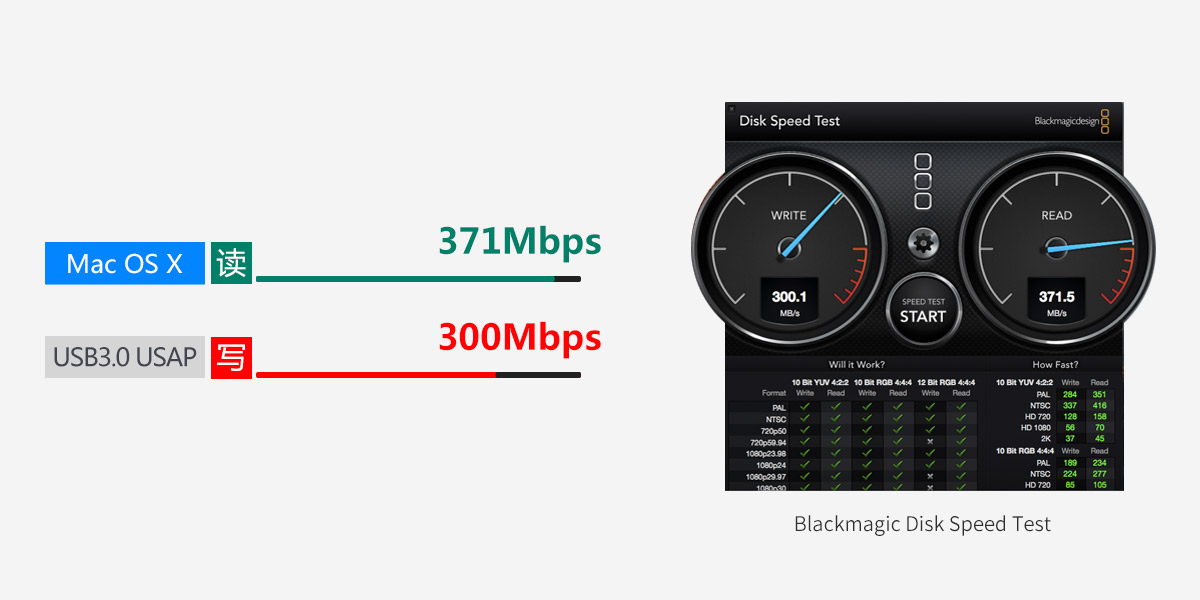 安装120GB固态盘,Mac OS X系统中,使用Blackmagic Disk Speed Test软件测试,读370MB/s,