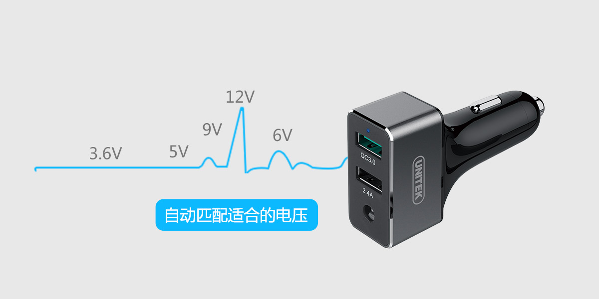 采用原厂进口高性能QC3.0智能充电芯片,提供3.6V到12V之间自动匹配适合的电压为不同