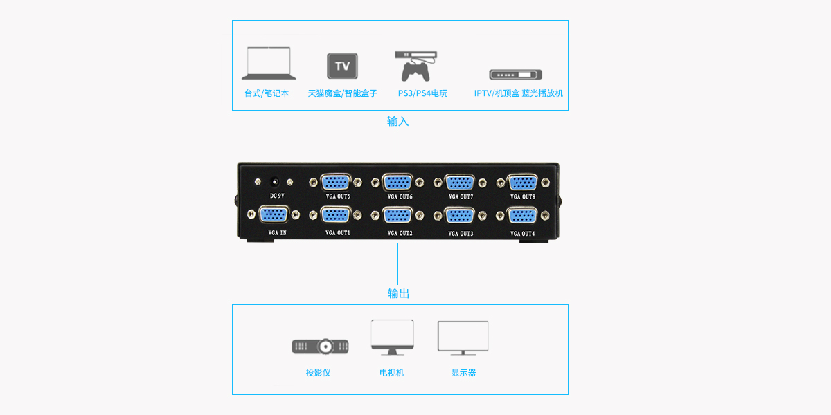 一台主机设备连接切换器,将一组输入信号,同步输出到八台显示器显示或电视、投影仪上,图像