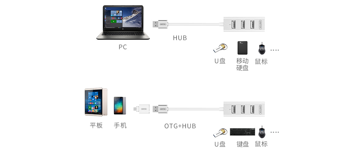 一张图看懂台式机/笔记本/平板/手机与集线器 连接,扩展各种USB外接设备,如鼠标、键盘、U盘、打印机、